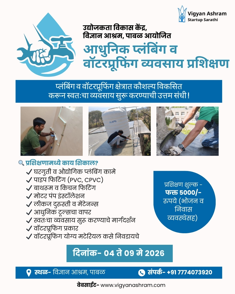 दिनांक- 04 मे -09 मे 2026 5000 रु फक्त उद्योजकता विकास केंद्र, विज्ञान आश्रम, पाबळ आयोजित शिका प्लंबिंग + वॉटरप्रूफिंग! 100% प्रॅक्टिकल प्रशिक्षण विज्ञान आश्रम, पाबळ राहण्याची,भोजनाची सोय + प्रमाणपत्र स्वतःचा व्यवसाय सुरू करण्याची संधी! नोंदणी सुरू – मर्यादित जागा! प्रवेशाकरिता संपर्क – 7774073920 नावनोंदणी करा नाव ई-मेल मोबाईल नंबर